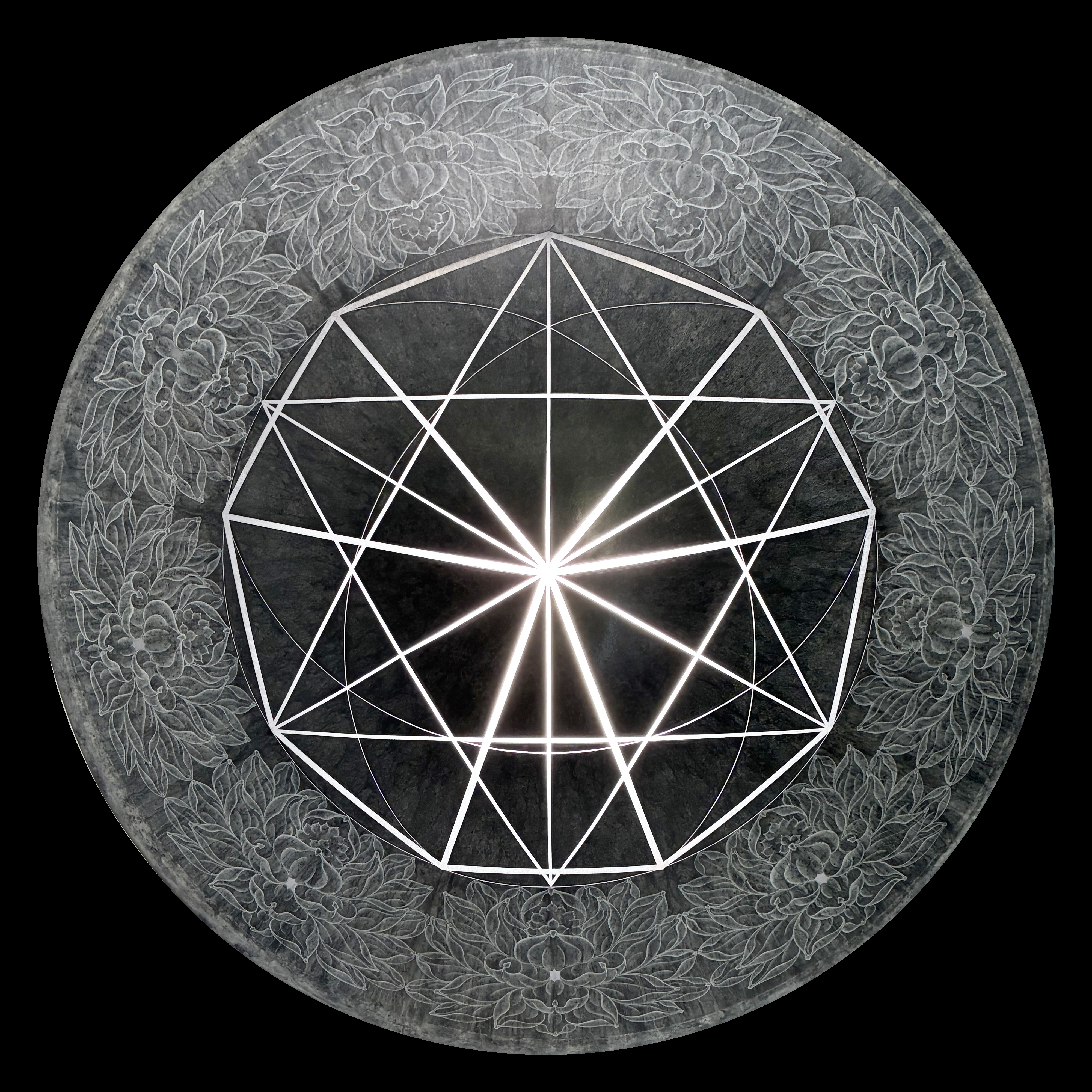 Silverpoint, graphite, stainless steel, mars and carbon black, titanium white pigment with acrylic binder on acrylic hemisphere with internal light
