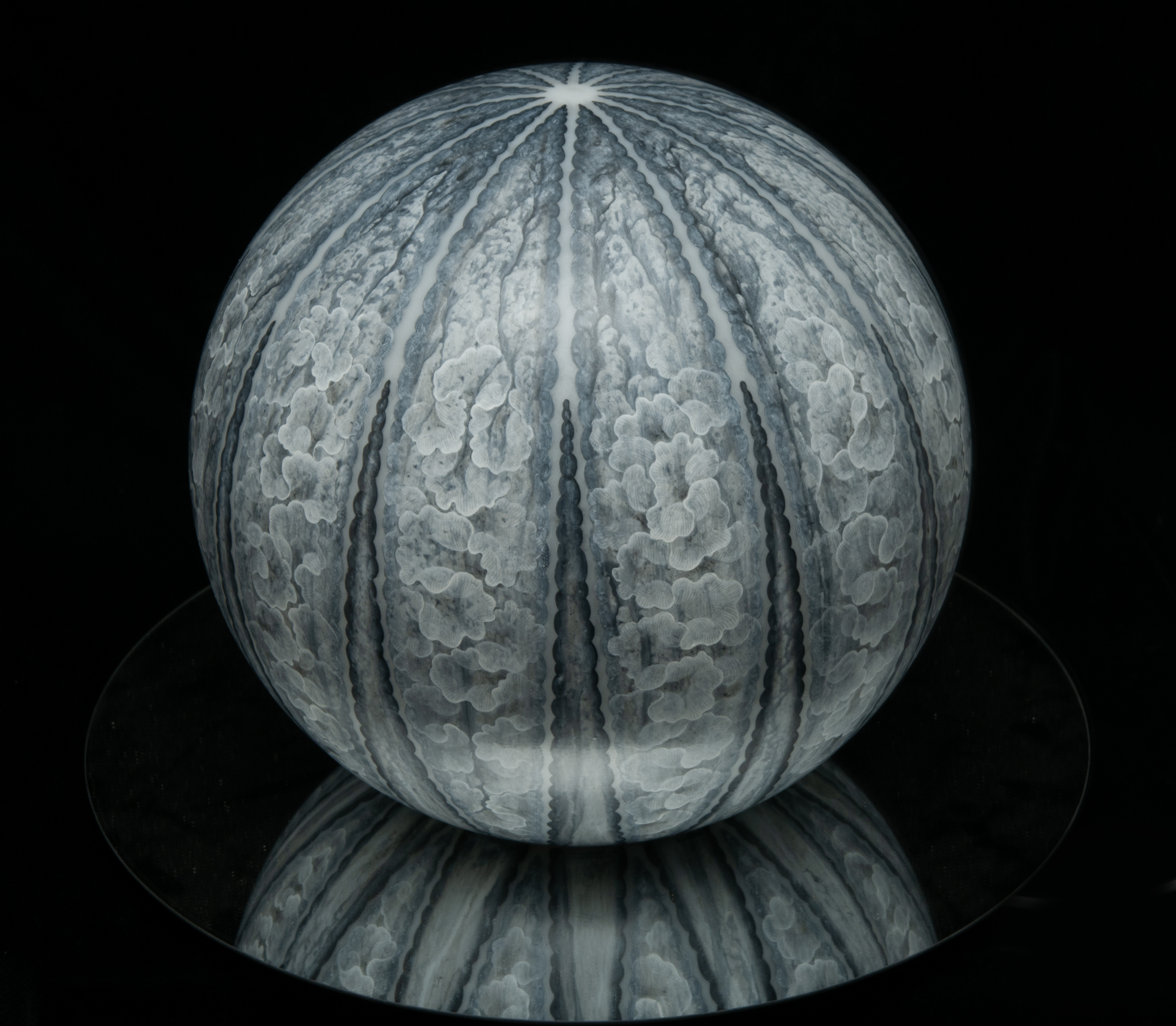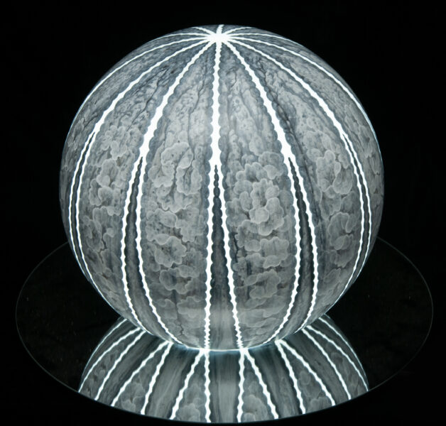 Silverpoint, graphite, stainless steel, titanium white and carbon black pigment with acrylic binder on acrylic sphere