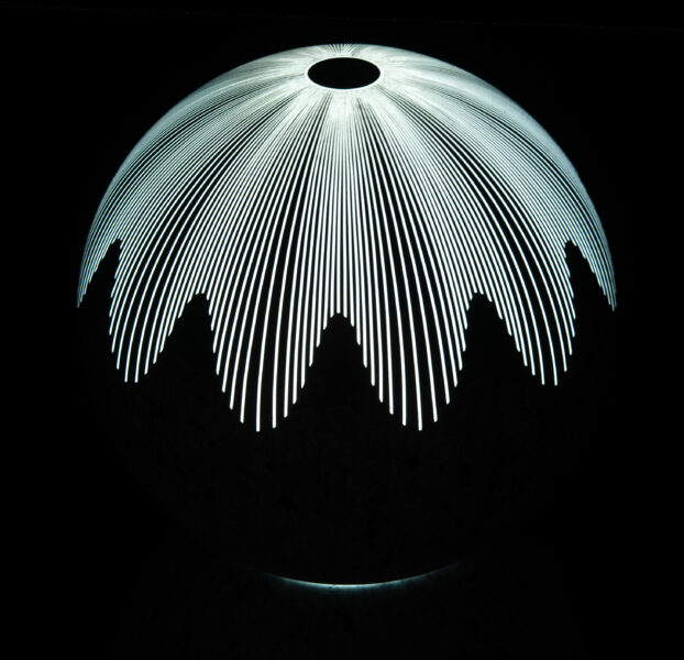 Silverpoint graphite, stainless steel, titanium white and carbon black pigment with acrylic binder on acrylic sphere